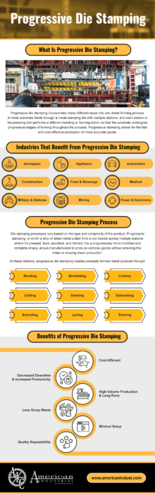 Progressive die stamping incorporates many different steps into one metal forming process. A metal substrate feeds through a metal stamping die with multiple stations, and each station in the pressing tool performs a different bending or forming action so that the substrate undergoes progressive stages of forming throughout the process. Having one die set containing all the tools needed for a component’s production is more efficient than traditional processes, which require multiple tools that the operator will switch out after each press. Progressive die stamping allows for the fast and cost-effective production of more accurate goods.